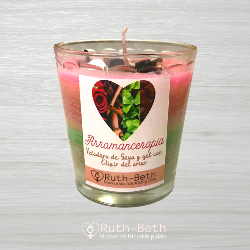 Colección Arromancerapia Veladora base de soya para masaje con 4 esencias estimulantes para atraer el amor propio: una mezcla deliciosa de menta, chocolate, rosas y canela te ayudan a despertar los sentidos del amor. Veladora intencionada para irradiar energía del rayo rosa. Enciéndela en un lugar seguro, y utiliza la cera derretida con cuidado para untarla en manos, pies, espalda. Contiene Elixir del amor